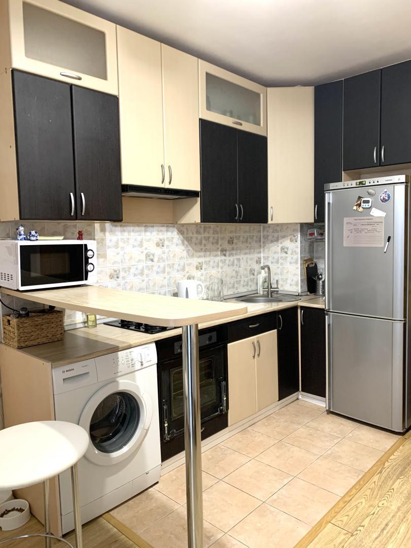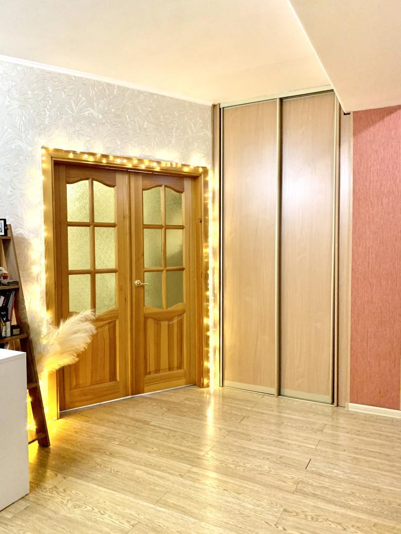 Продается квартира в хорошем состоянии с интересной планировкой. На 49 кВ.м выполнена небольшая спальня с выходом на балкон, просторная гостиная 24 кВ.м, хорошая площадь кухни 13 кВ.м. Два встроенных шкафа-купе, кухонный гарнитур с техникой входит в стоимость квартиры. Совмещенный санузел полностью в кафеле. Выровненные потолки, ламинат на полу в комнатах. В данной квартире два балкона и одна лоджия. На лоджии установлены инфракрасные лампы обогрева, здесь возможно развести зимний сад или оборудовать рабочий кабинет. На одном балконе есть небольшая кладовая, на втором - шкаф для хранения. Дом теплый. Закрытая территория. Есть детская площадка. Парковка. Вокруг все необходимое для комфортного проживания - магазины, аптеки, общественный транспорт в любую точку города, поликлиника, парк на Королева и многое другое. Квартира на чистой продаже. Один взрослый собственник.