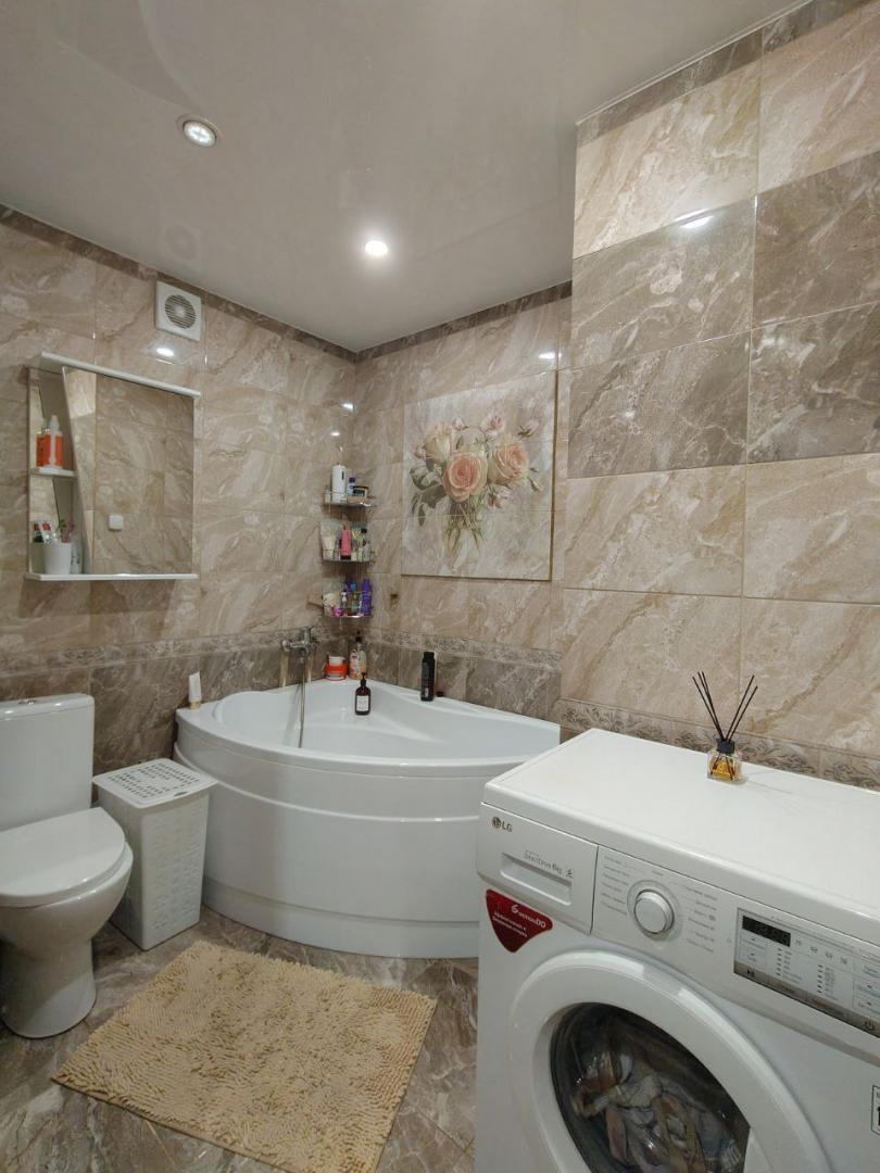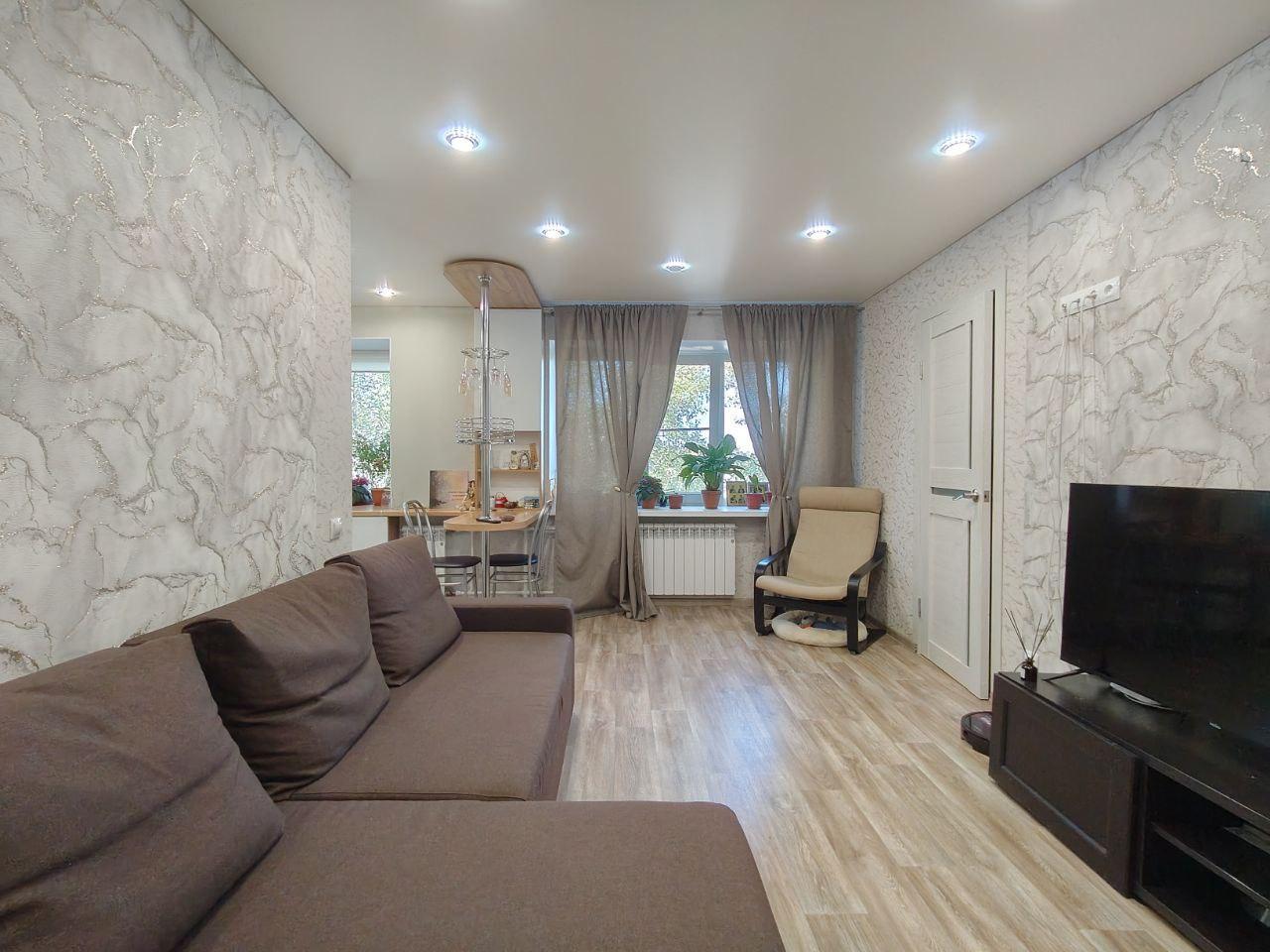 Квартира с ремонтом, полностью готова к проживанию, отличный современный дизайн кухни -студии с просторной комнатой и большой санузел, создают в квартире уютную атмосферу. Раковина на кухне у окна будет воплощением желаний многих хозяек. Имеются еще две небольшие комнаты, одна из них используется как гардеробная, но по желанию может быть и жилой комнатой. Санузел в кафеле и очень просторный, квартира светлая и теплая. Соседи хорошие.