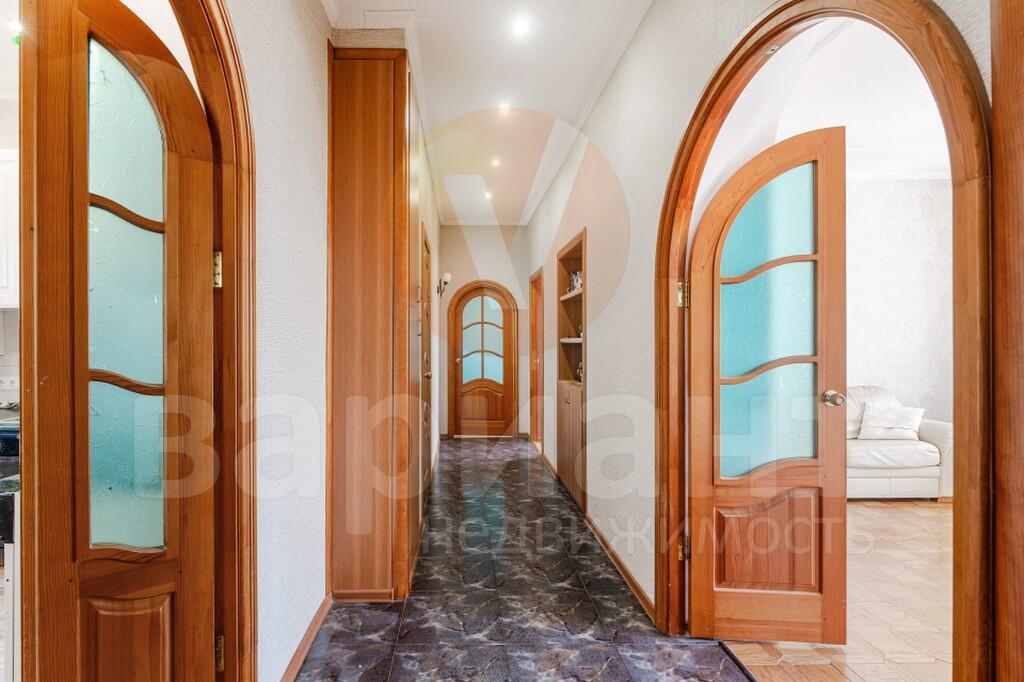 В спальнях и гостиной на полу паркет, в прихожей, кухни и санузле керамогранит. Межкомнатные двери - массив дерева.