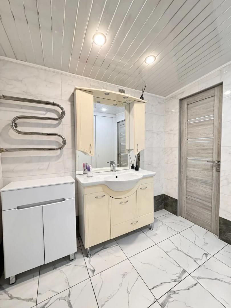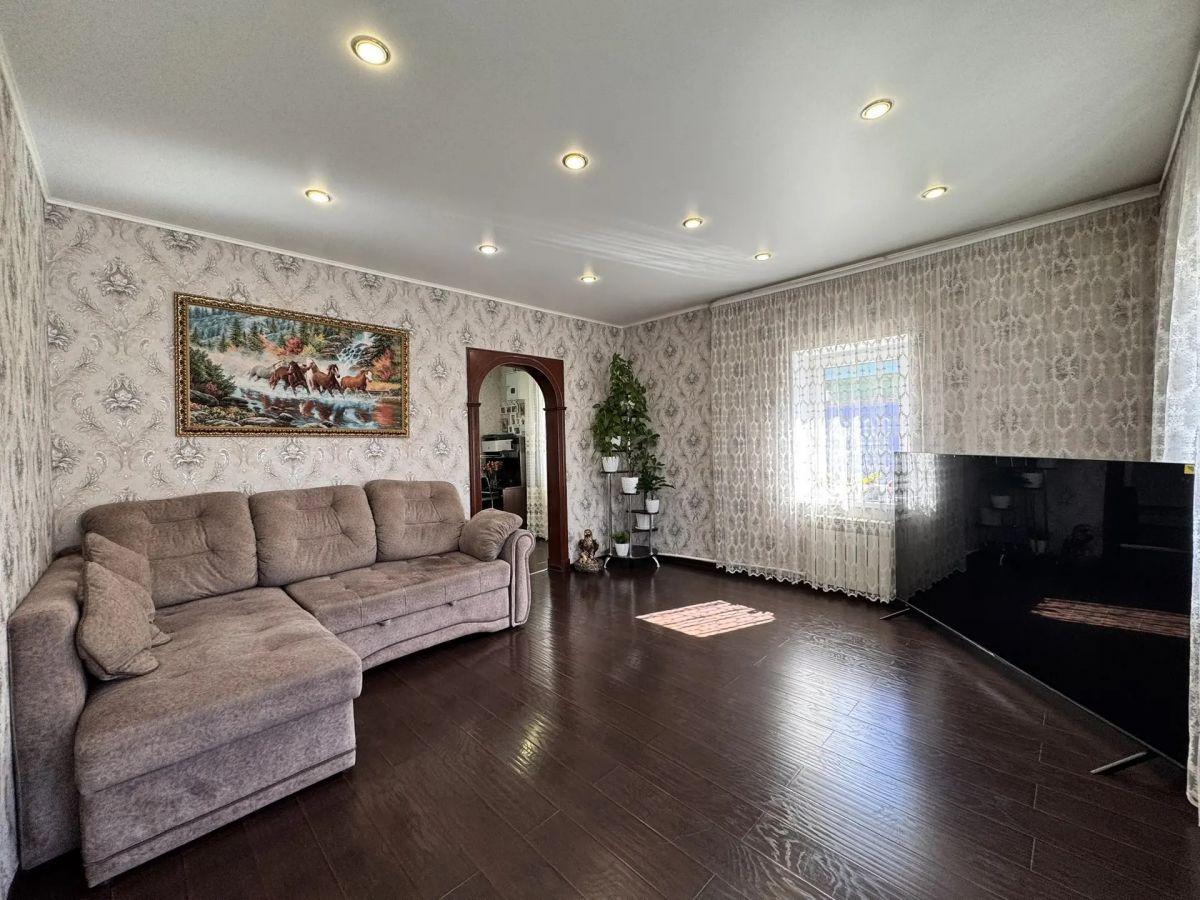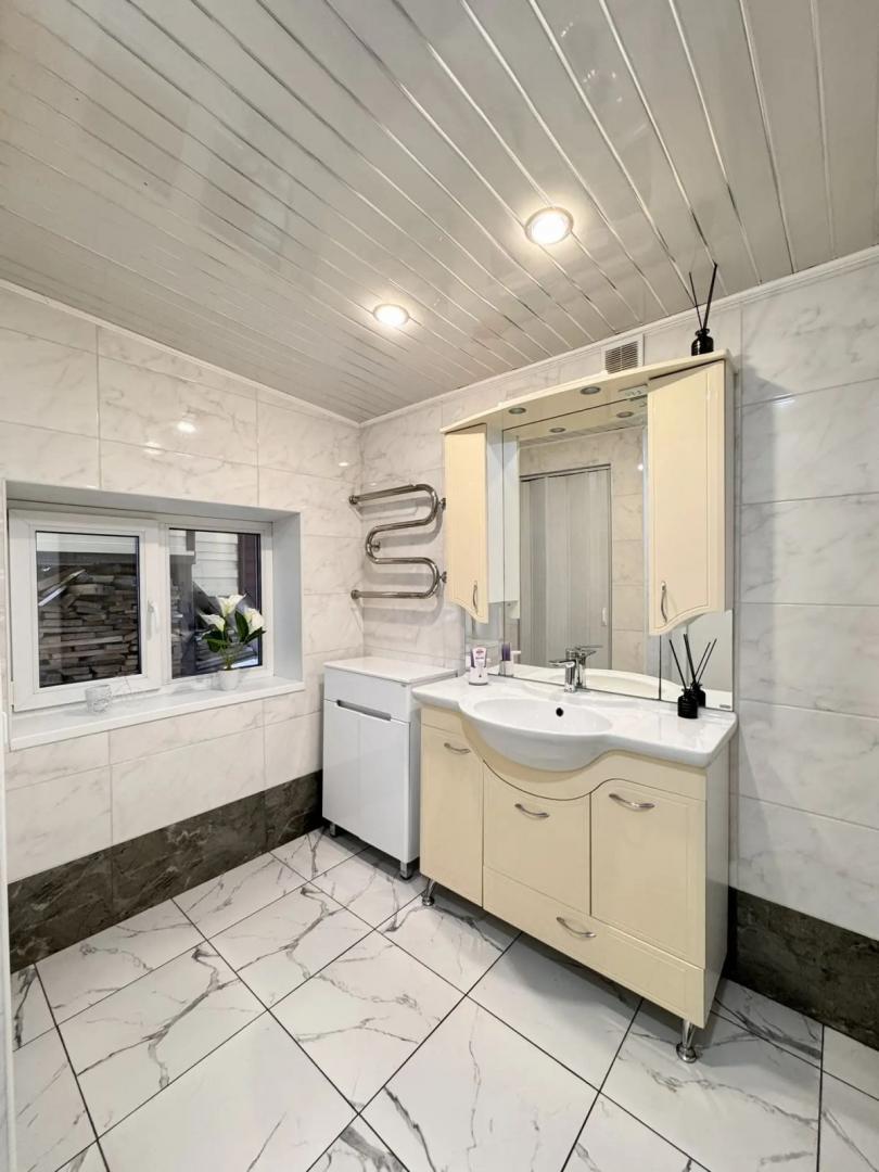 Номер объекта: 537555. Агентство недвижимости «Домофон» представляет вашему вниманию просторный и современный отдельно стоящий дом, который станет идеальным выбором для комфортной семейной жизни. Описание дома: ·         Первый этаж: шлако-литой, включает три комнаты, просторную уютную кухню и удобный санузел. ·         Второй этаж: каркасный, оборудован двумя уютными спальнями, просторным холлом и дополнительным санузлом. ·         Ремонт: выполнен в современном стиле, установлены натяжные потолки, что придаёт дому особый шарм и уют. ·         Полы: на первом этаже — керамогранит, в спальнях — ламинат, что обеспечивает комфорт и тепло. ·         Отопление: продуманная система электроотопления, тёплый пол на кухне, в санузле и бане (кроме парилки), что гарантирует тепло и уют в любое время года. Участок и двор: ·         Двор: выложен плиткой, участок правильной формы, что позволяет наслаждаться пространством. ·         Хозяйственные постройки: отличная баня с выходом в дом, теплица для выращивания свежих овощей и зелени. ·         Парковка: комфортный подъезд, достаточно места для автомобиля. Комфорт и инфраструктура: ·         Центральные коммуникации: вода, газ, электроэнергия. ·         Канализация: септик, что обеспечивает комфорт и удобство. ·         Район: спокойный и зелёный, в шаговой доступности находятся магазины, школы, детские сады и остановки общественного транспорта. Не упустите свой шанс стать обладателем этого замечательного дома! Это отличное место для тех, кто ценит уют, тишину и развитую инфраструктуру.