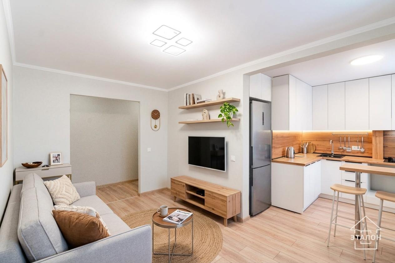 • Планировка: Продуманное пространство с акцентом на функциональность. Просторная гостиная объединена с зоной кухни, создавая открытую атмосферу для общения.